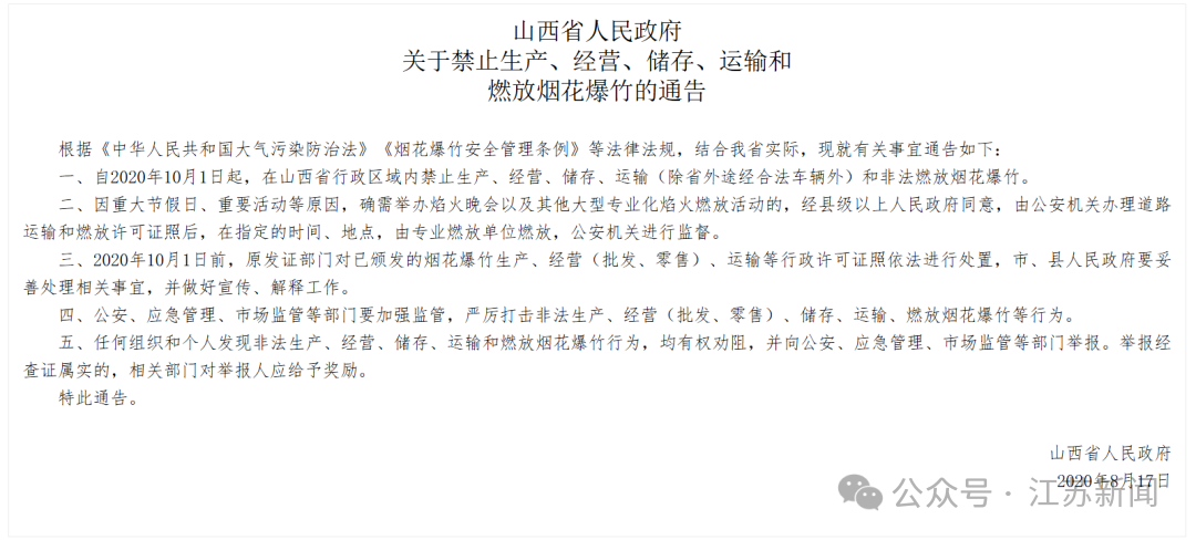 该通告当时表示,自2020年10月1日起,在山西省行政区域内禁止生产、经营、储存、运输(除省外途经合法车辆外)和非法燃放烟花爆竹。