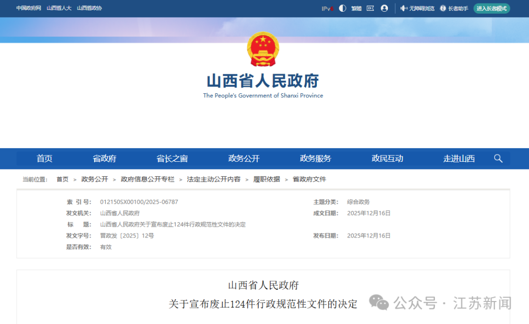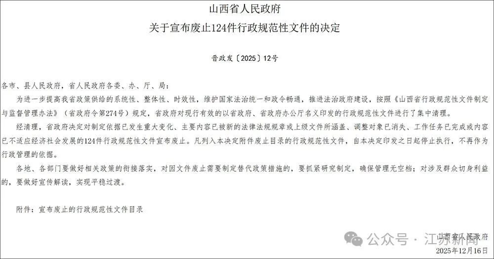 决定表示,经清理,山西省政府决定对制定依据已发生重大变化、主要内容已被新的法律法规规章或上级文件所涵盖、调整对象已消失、工作任务已完成或内容已不适应经济社会发展的124件行政规范性文件宣布废止。凡列入本决定附件废止目录的行政规范性文件,自本决定印发之日起停止执行,不再作为行政管理的依据。