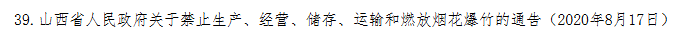 在公布的文件目录中,2020年8月17日发布的《山西省关于禁止生产、经营、储存、运输和燃放烟花爆竹的通告》也被宣布废止。