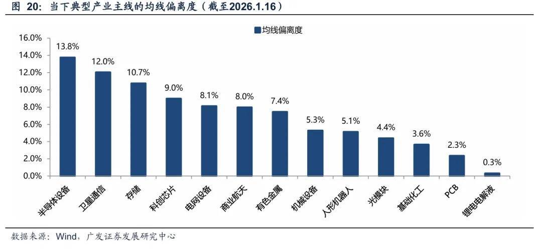 结合年报预告前瞻、一季报前瞻、板块的均线偏离度,26 年高景气预期的方向有望在“天量”前后贯穿表现,其中部分滞涨领域可重点关注——【有色(铜)】、【储能锂电】(电池/锂电材料)、【海外算力链】、【半导体和存储】。