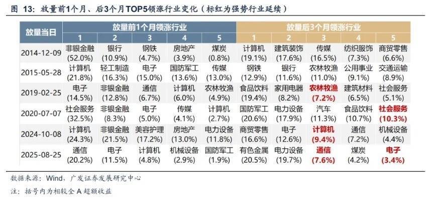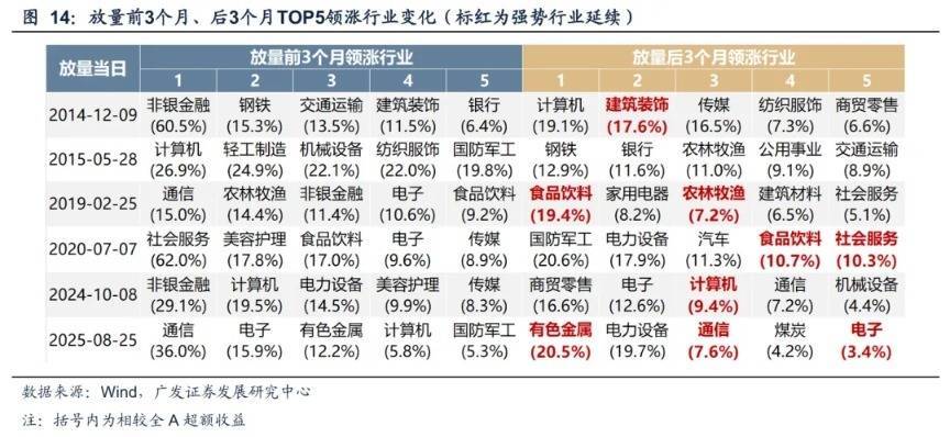 能够在放量前后、延续强势的行业,均对应着基本面预期最强劲、产业逻辑最过硬的方向(14年一带一路建筑,19年消费龙头,20年社服免税,25年AI和有色,等等)。