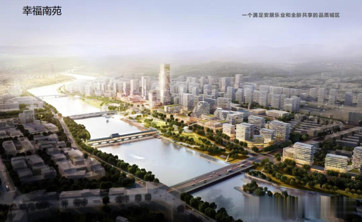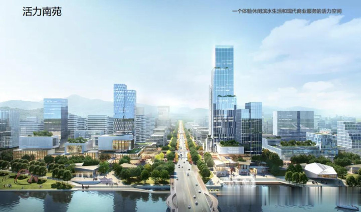 本次招标公告附带了永康南苑区块初步设计方案,一睹为快。上文中提到的限高150米的超高层,应该就是效果图中最高的这一栋楼。