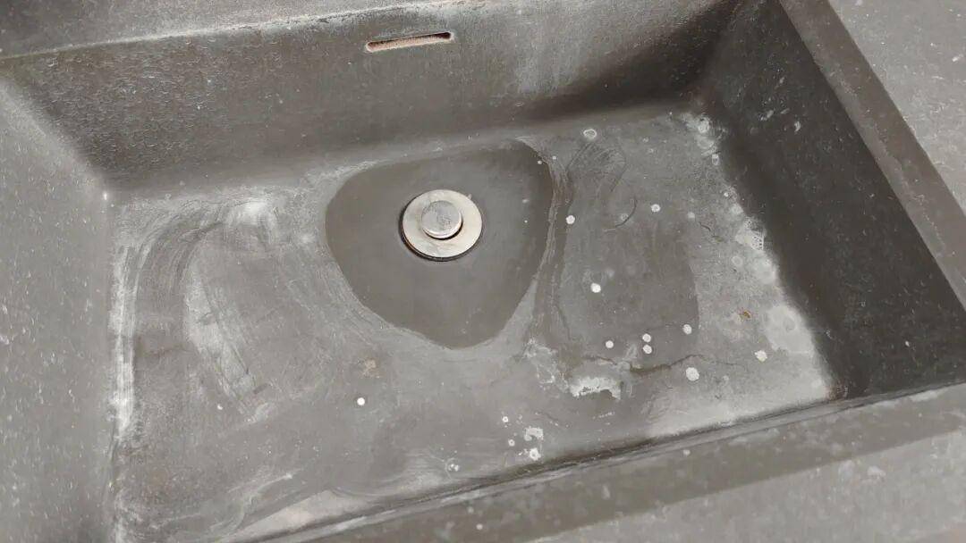 👉现实是:我家的岩板一体盆,盆体深度不够,每次洗手、洗脸都会溅得台面全是水;盆体边角也是直角,虽然看起来无缝,但实际使用中,牙膏渍会卡在角落里,比普通台盆更难清洁;而且台面过于平缓,下水速度慢,用过后盆里总会残留一层积水,时间久了会留一层发白的水垢。
