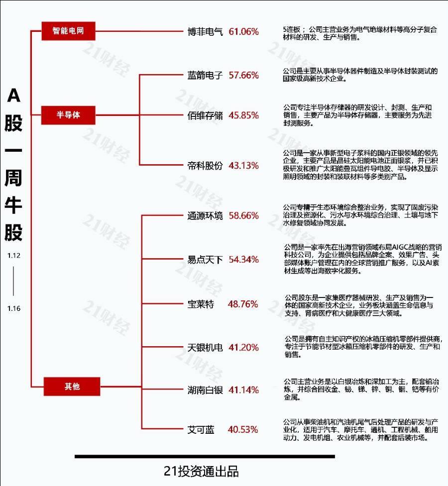 国家电网"十五五"拟投4万亿,最牛股博菲电气5连板本期牛股榜中,博菲电气(001255.SZ)以61.06%的周涨幅夺魁,通源环境(688679.SH)以58.66%的涨幅位居第二,蓝箭电子(301348.SZ)、易点天下(301171.SZ)、宝莱特(300246.SZ)、佰维存储(688525.SH)周涨幅超45%。本期牛股榜十只个股过去一周累计涨幅均超过40%。